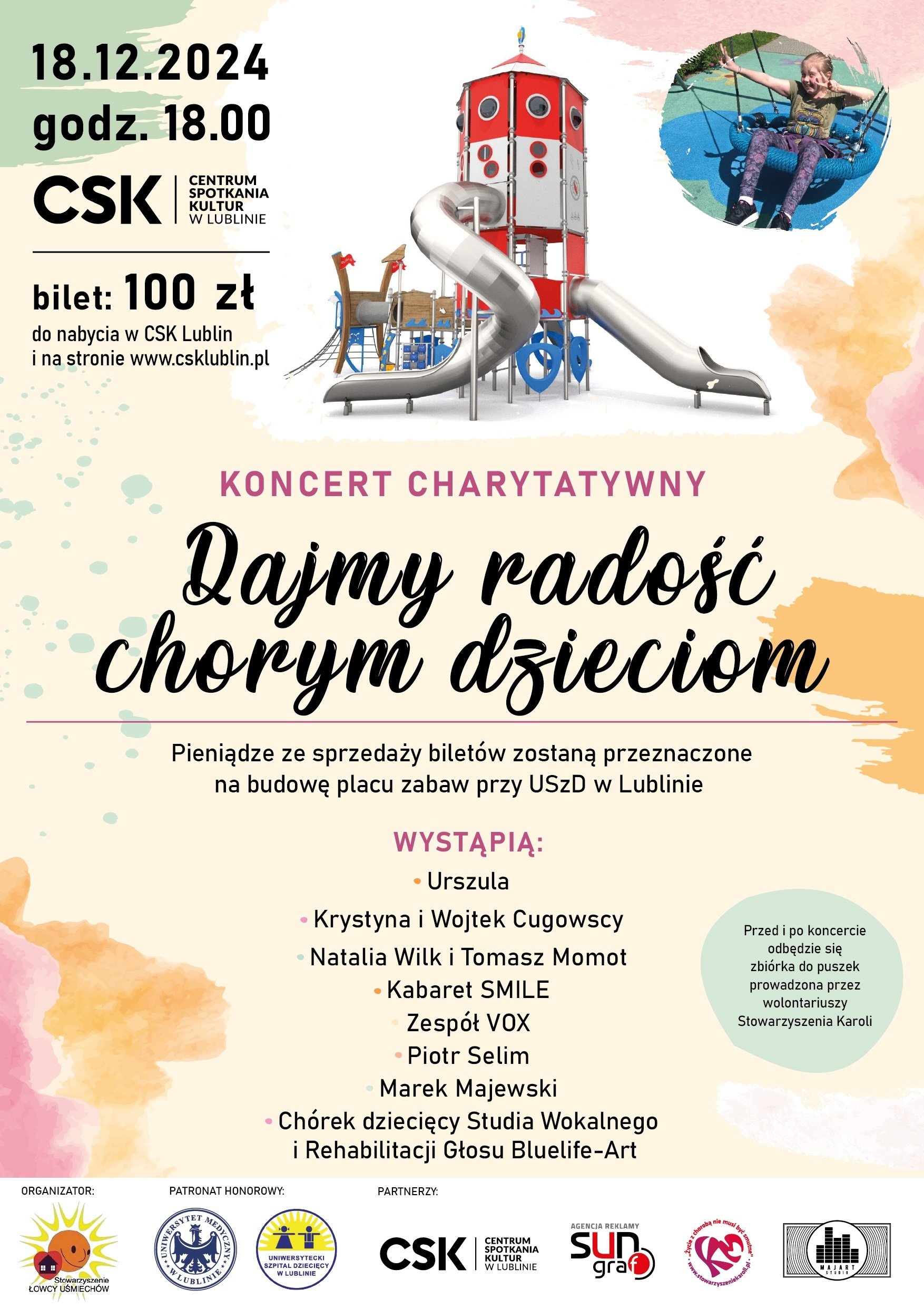 Koncert "Dajmy radośc chorym dzieciom" został przygotowany przez Lubelskich Artystów, a dedykowany był Małym Pacjentom Uniwersyteckiego Szpitala Dziecięcego w Lublinie. Zapoczątkował on wielkie przedsięwzięcie jakim jest utworzenie zewnętrznego placu zabaw koło Szpitala.