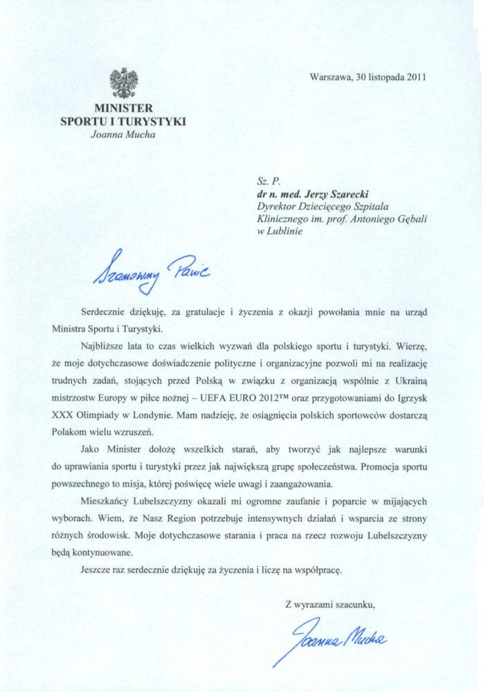 Na ręce Dyrektora DSK nadeszły podziękowania od Minister Sportu i Turystyki Joanny Muchy.