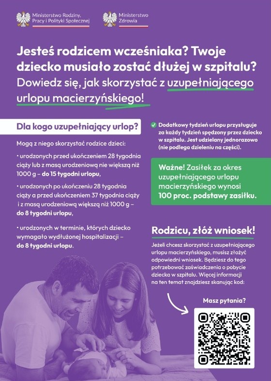 Informacja Ministerstwa Rodziny, Pracy i Polityki Rodzinnej we współpracy z Ministerstwem Zdrowia w sprawie możliwości skorzystania z dodatkowego urlopu macierzyńskiego dla rodziców wcześniaków