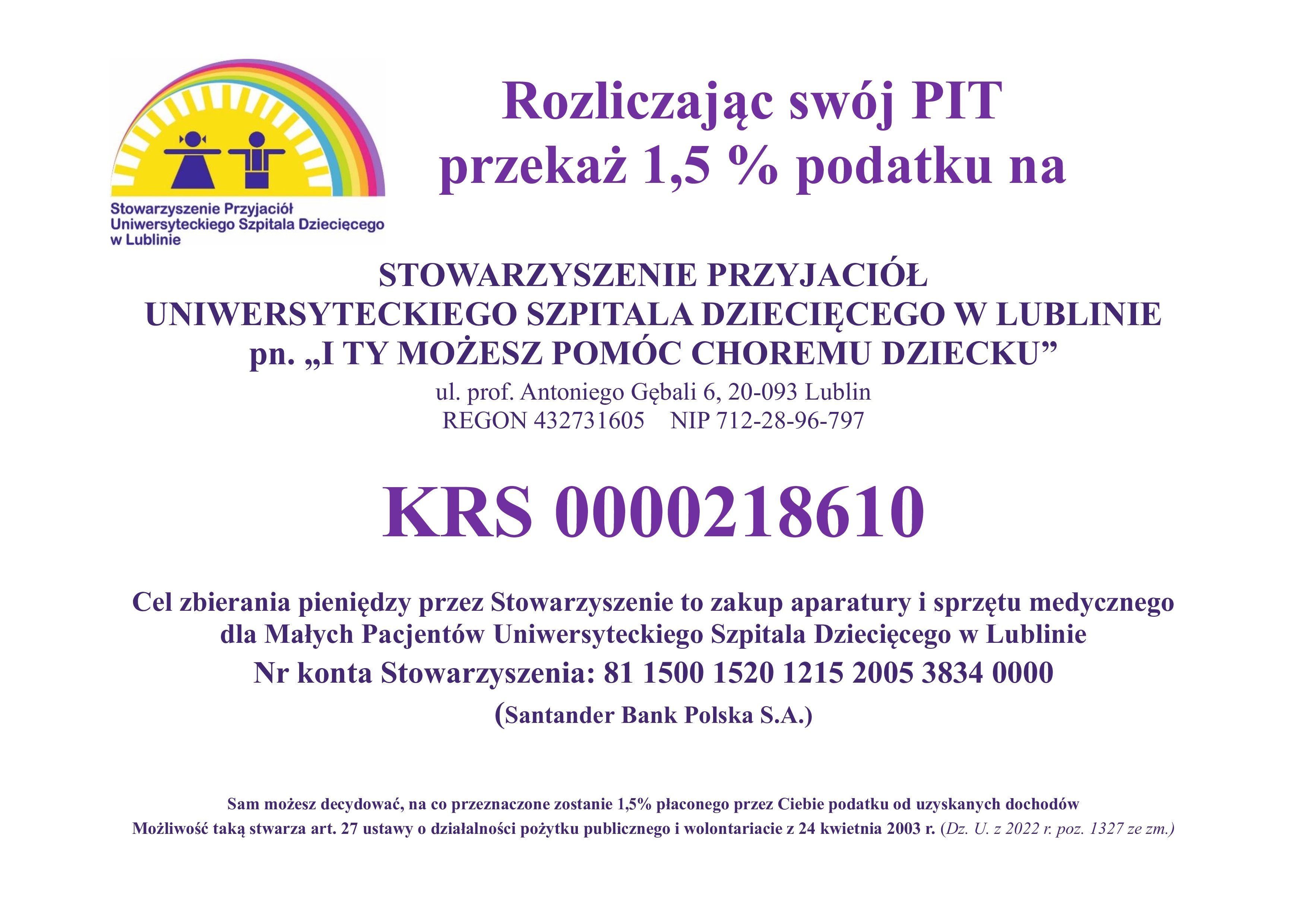 PRZEKAŻ 1,5% PODATKU NA RZECZ STOWARZYSZENIE PRZYJACIÓŁ UNIWERSYTECKIEGO SZPITALA DZIECIĘCEGO PN. "I TY MOŻESZ POMÓC CHOREMU DZIECKU"