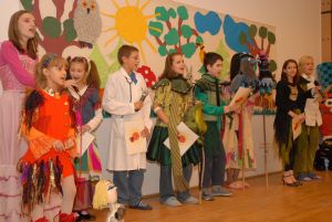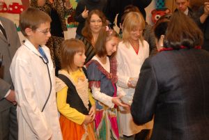 Kulminacyjnym punktem wizyty było półgodzinne spotkanie z pacjentami, rodzicami dzieci i pracownikami Szpitala w Auli DSK. Dzieci w napięciu oczekiwały Księżnej, oczywiście w koronie. Kilkoro z nich rozczarowanych było faktem braku tego atrybutu królewskiego. Jednak to rozczarowanie szybko przysłoniły zdolności artystyczne Małych Pacjentów, jakie przedstawili na scenie. Mali artyści zaprezentowali się w najwyższej klasie, poprzebierani w teatralne stroje, wśród postaci bajkowych i własnoręcznie wykonanej dekoracji przez uczniów Zespołu Szkół przy DSK. Mimo założonych skomplikowanych aparatów ortopedycznych czy dolegliwości chorobowych, dzieci podczas ostatniego tygodnia dzielnie uczestniczyły w próbach pod kierownictwem nauczycieli ze Szkoły. Do programu artystycznego z wielką radością i zaangażowaniem włączyli się także wolontariusze, którzy nie tylko przygotowali własne, pomysłowe stroje, ale również repertuar piosenek baśniowych i dziecięcych. Księżna oglądając występ zadawała pytania o treść słów recytowanych wierszy czy śpiewanych piosenek. Klaskała w dłonie w rytm piosenek odśpiewanych nie tylko przez dzieci, ale i przez wolontariuszy – młodzieży pracującej i studentów lubelskich uczelni, od lat współpracujących ze Szpitalem. Opiekę nad nimi sprawuje Kapelan Szpitala Ks. Kan. Dariusz Bondyra. Prawdziwym przebojem był występ byłych pacjentów Natalii i Piotra, którzy zatańczyli sambę, jiva i cha-chę. Jeden z lekarzy Tajskiego Czerwonego Krzyża nie mógł się oprzeć, aby nie wyrazić swojego podziwu dla małych tancerzy. Po gromkich brawach po całym występie artystycznym nadszedł czas na prezenty. Jej Wysokość z rąk Dyrektora Szpitala, Dyrektora Zespołu Szkół przy DSK i pacjentów otrzymała obraz namalowany przez dzieci. W zamian Dyrektorzy otrzymali figurki przedstawiające baśniowe postacie tajlandzkie. Księżna wręczyła małym artystom, a także zgromadzonym dzieciom wspaniałe podarunki – pomoce szkolne (kredki, flamastry), książeczki do malowania, książeczki w języku angielskim, figurki przedstawiające tajlandzkie postacie baśniowe i skórzane etui na klucze dla wolontariuszy. Ci, co nie mogli przyjść do Auli DSK z powodu choroby, nie zostali pominięci. Panie Oddziałowe zabrały dla tych pacjentów podarunki i rozdały dzieciom w Oddziałach, wzbudzając ich radość i zadowolenie.