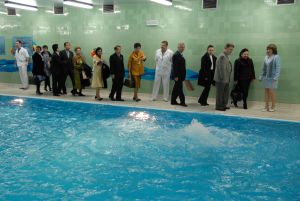Przedostatnim punktem wizyty był Zakład Rehabilitacji. Podświetlony basem DSK i tryskające bąbelki wody z urządzeń do hydromasażu zauroczyły tajlandzką delegację. Doskonałe udogodnienia dla rehabilitowanych pacjentów wzbudziły wiele pozytywnych komentarzy. Najmłodsi pacjenci odbywający ćwiczenia rehabilitacyjne w wannach do hydromasażu z ozonem i masażu wirowego kończyn, z uśmiechem na buzi i pełnym zadowoleniem z przyjemnych zabiegów, witali Jej Wysokość. Dzieci chętnie odpowiadały na zadawane pytania o odbywane zabiegi.