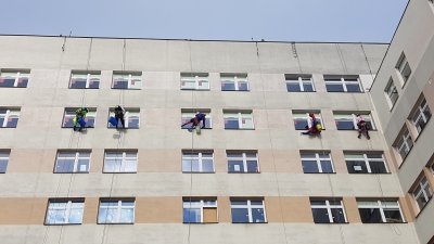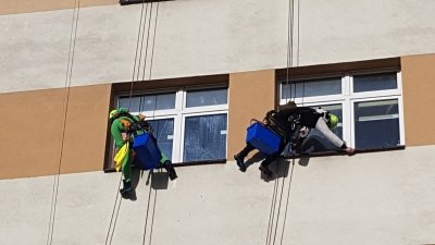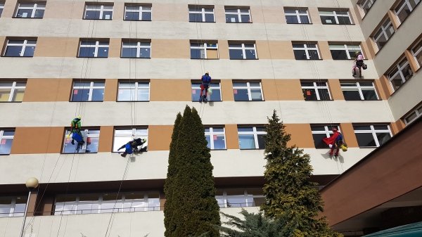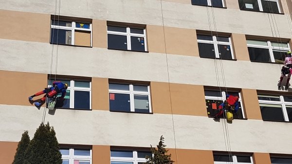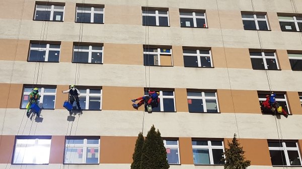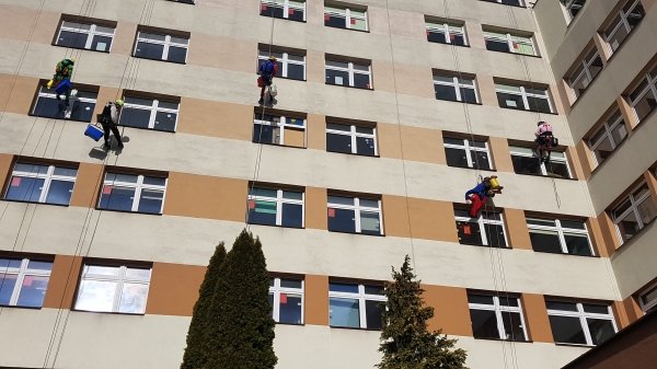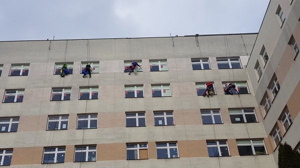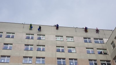 Alpiniści zajrzeli w okna sal chorych schodząc z dachu Uniwersyteckiego Szpitala Dziecięcego w Lublinie