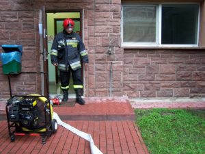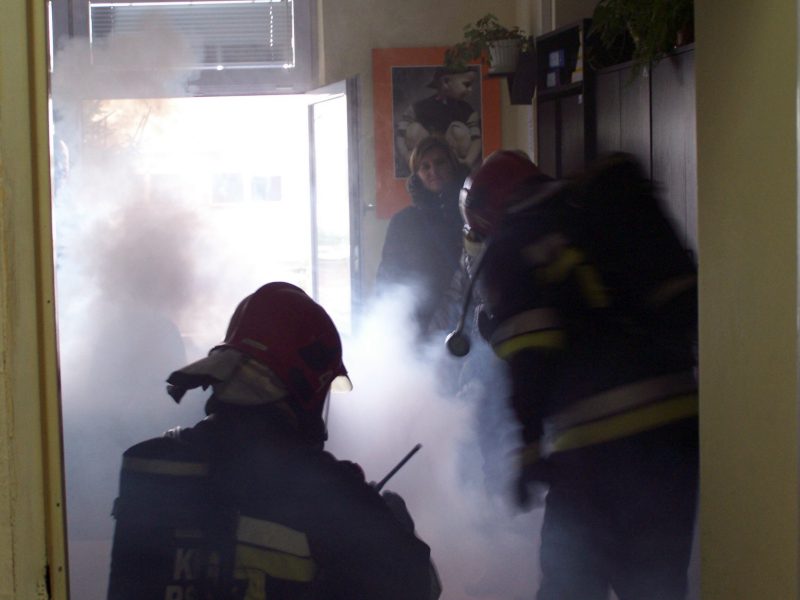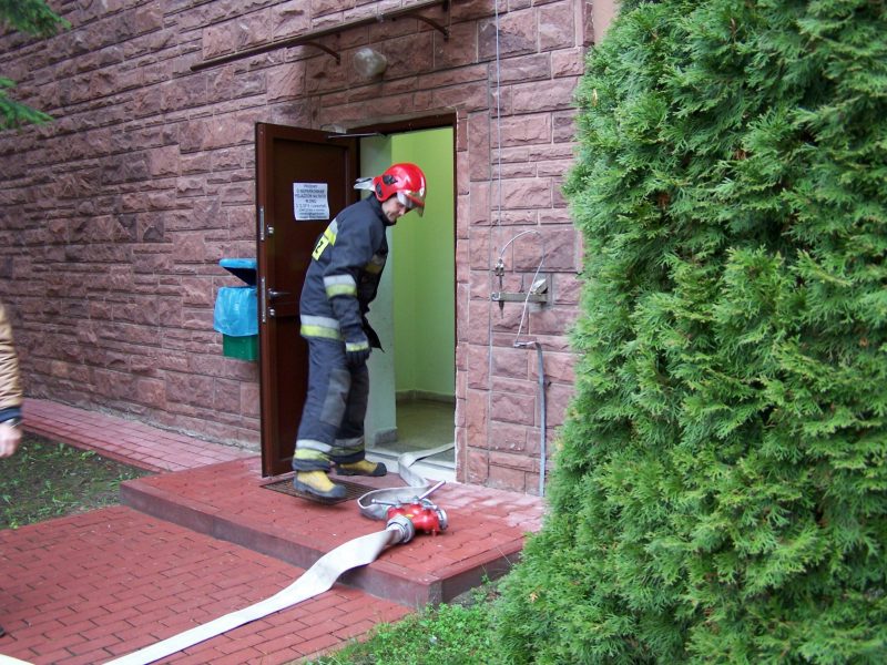 Po przybyciu na miejsce zdarzenia zastępów Państwowej Straży Pożarnej dyrektor przekazał dowódcy informację o zaistniałej sytuacji i podjętych działaniach. Strażacy zabezpieczeni w linię gaśniczą i sprzęt ochrony dróg oddechowych wprowadzili do budynku prąd gaśniczy w celu zlokalizowania i ugaszenia pożaru oraz ewakuacji osób poszkodowanych.