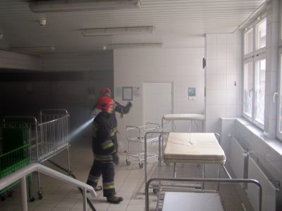 W pomieszczeniach Działu Sterylizacji DSK, w wyniku nieumyślnego zaprószenia ognia, powstaje pożar.