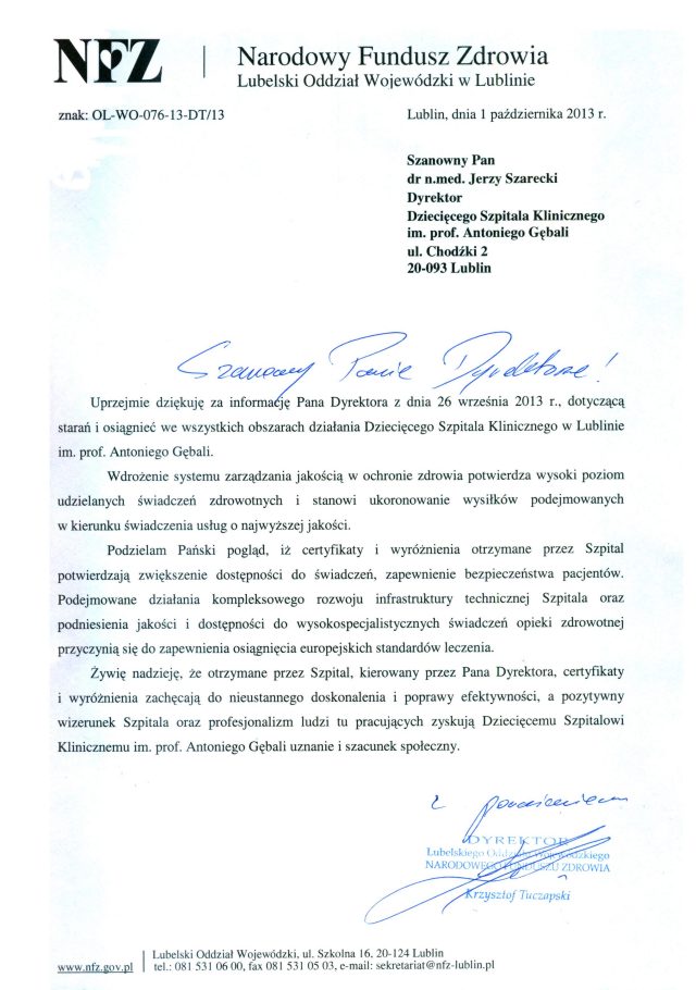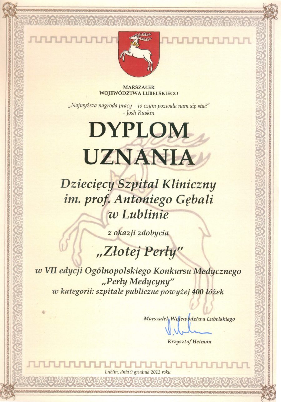 Dziecięcy Szpital Kliniczny w Lublinie został laureatem I nagrody w Ogólnopolskim Konkursie Medycznym "Perły Medycyny 2013"