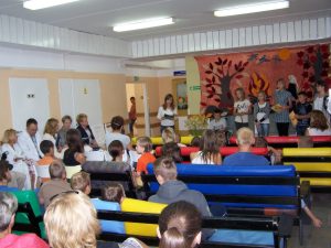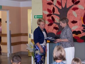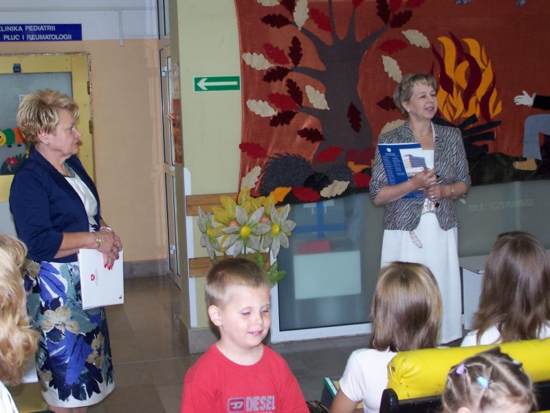 Następnie mgr Danuta Korniak – Dyrektor Zespołu Szkół powitała zebranych, zapoznała z zadaniami i strukturą szkoły szpitalnej, przedstawiła pracujących w niej nauczycieli i zaprosiła wszystkich do obejrzenia części artystycznej, przygotowanej, pod kierunkiem pedagogów, przez uczniów – pacjentów z Klinik: Pulmonologii i Rehabilitacji.