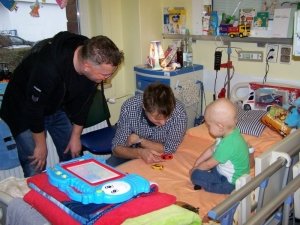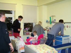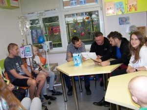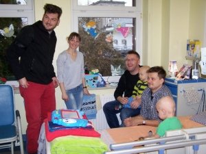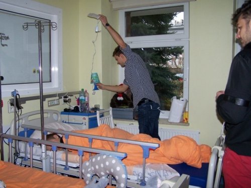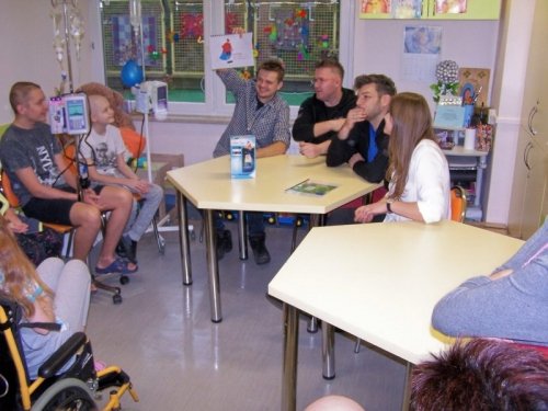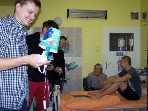 Panowie Andrzej, Michał i Paweł z Kabaretu SMILE oraz Fundacja DKMS odwiedzili Pacjentów Oddziału Hematologii, Onkologii i Transplantologii Dziecięcej USzD przekazując lampki do nocnego oświetlenia sal chorych.
