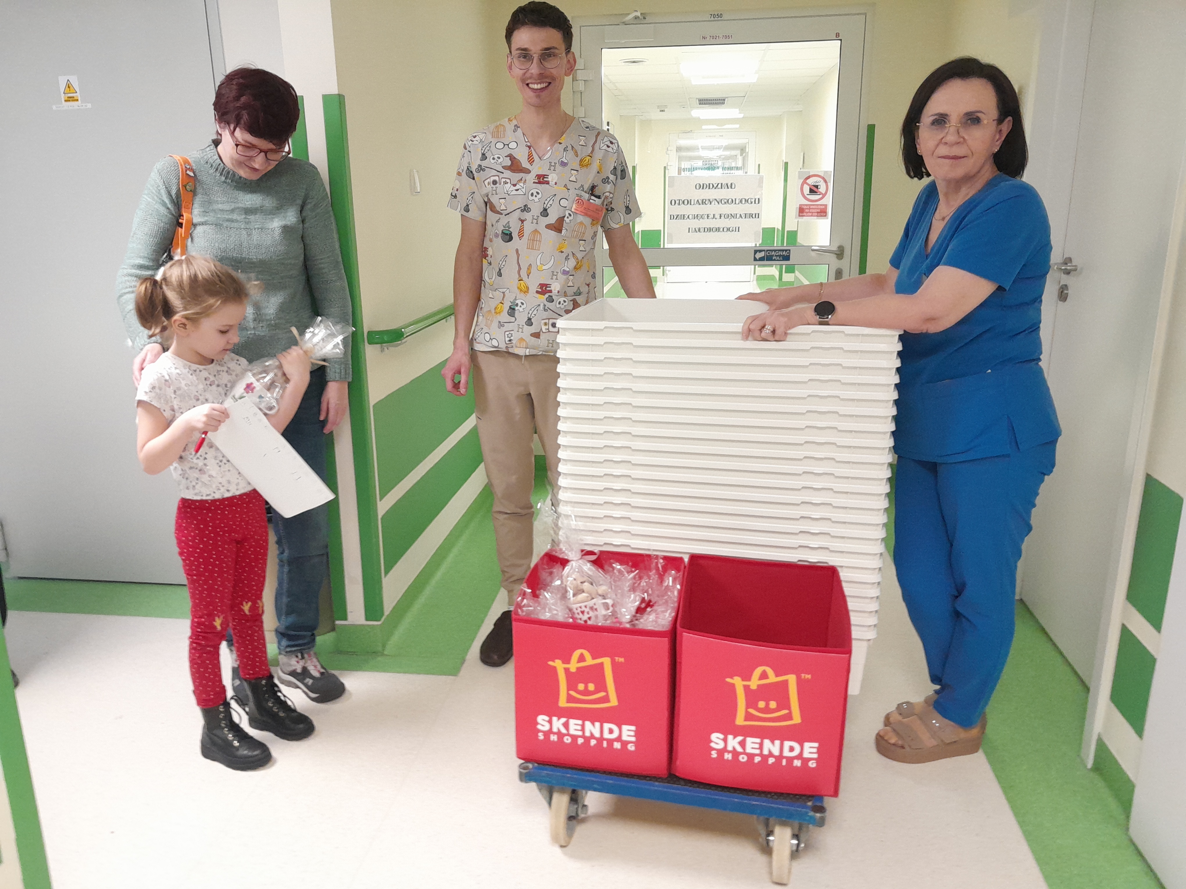 Ponadto SKENDE przekazało do Oddziału 21 kontenerków do przechowywania rzecz pacjentów pod szpitalnym łóżkiem oraz lodówkę do przechowywania łakoci dla dzieci podczas akcji ogólnoszpitalnych.