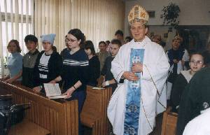 We Mszy czynny udział brały dzieci (powitanie Księdza Biskupa, czytanie w czasie Liturgii Słowa, wezwania podczas modlitwy wiernych, procesja z darami).
