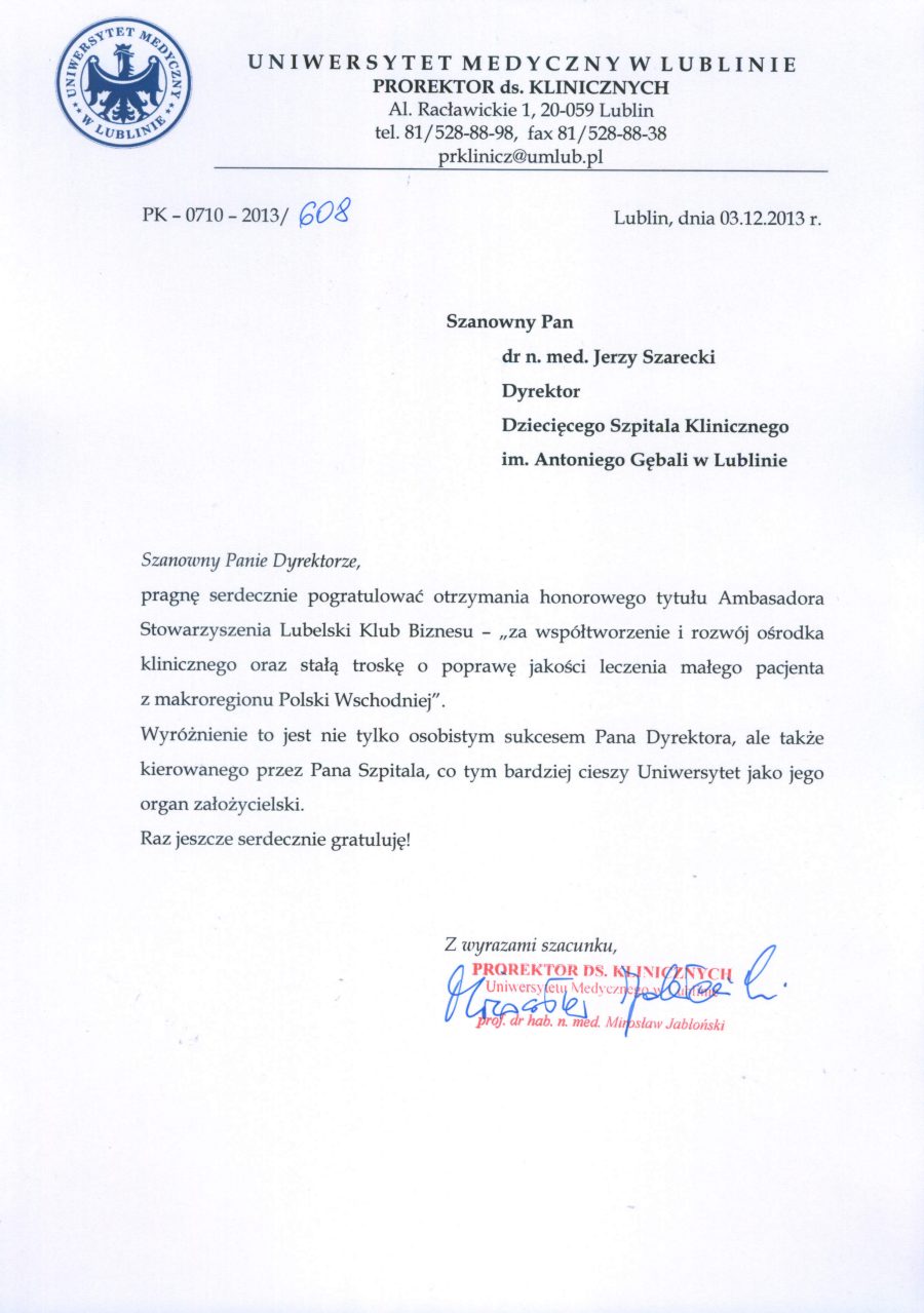 Tytuł Ambasadora Lubelskiego Klubu Biznesu dla Dyrektora DSK dr n. med. Jerzego Szareckiego