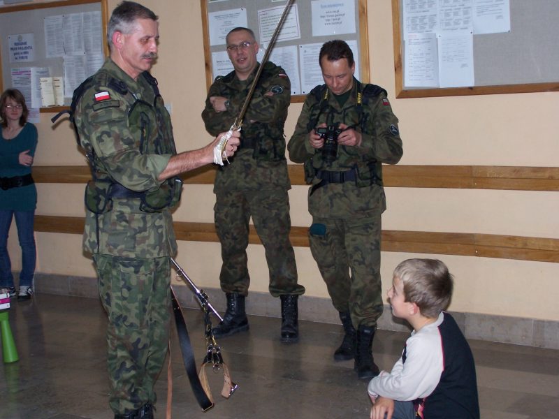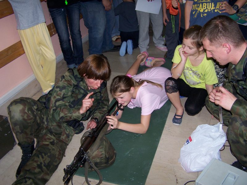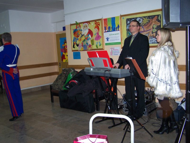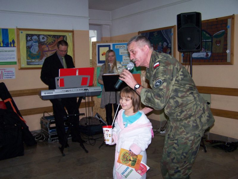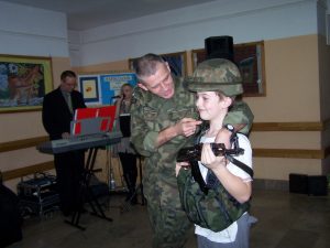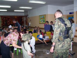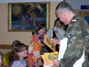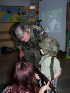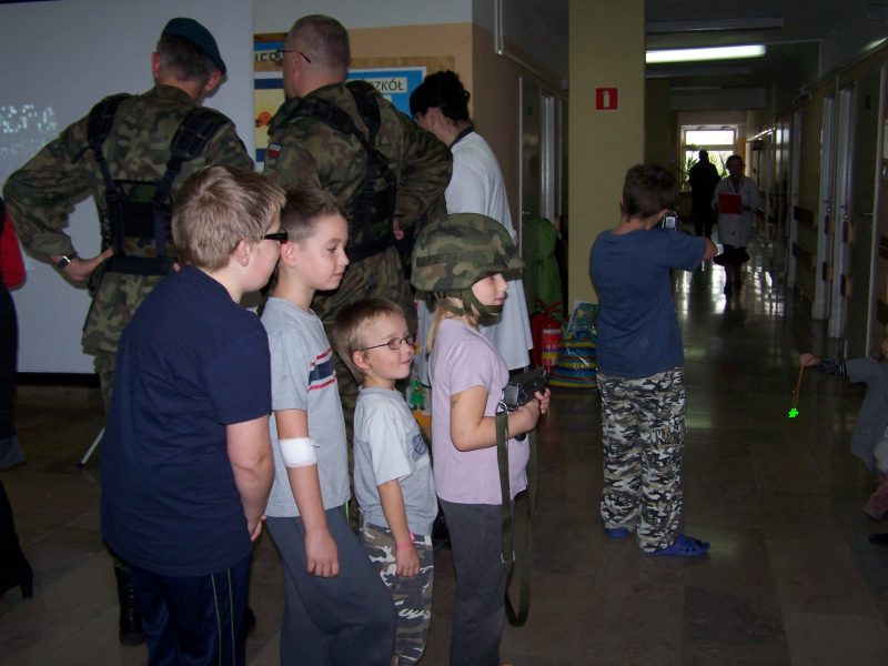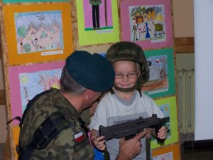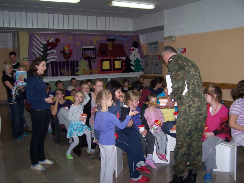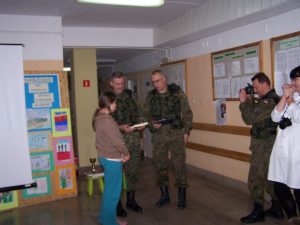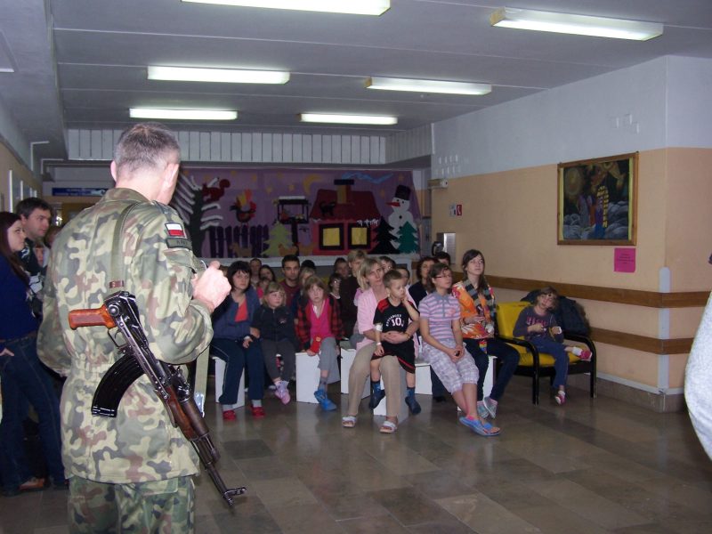 22 grudnia br. ppłk Dariusz Krzysztofik, kpt. Dariusz Drączkowski, ppor. Elżbieta Zdunek, st. chor. sztab. Waldemar Dąbczak oraz st. szer. zaw. Grzegorz Wnuk byli gośćmi Małych Pacjentów DSK już po raz trzeci. Tym razem przyjechali, aby wspólnie zaśpiewać kolędy i rozdać upominki świąteczne. Jak zwykle, atrakcją była prezentacja broni i wyposażenia wojskowego, a także symulator strzelniczy, gdzie każdy mógł bezpiecznie postrzelać do wirtualnej tarczy.