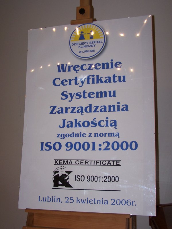 Uroczyste wręczenie CERTYFIKATU SYSTEMU ZARZĄDZANIA JAKOŚCIĄ ISO 9001:2000 miało miejsce 25 kwietnia 2006 r. w Auli DSK w Lublinie. W tak doniosłym dla Szpitala wydarzeniu udział wzięło wielu znamienitych gości, a wśród nich: JM Rektor Akademii Medycznej w Lublinie - prof. dr hab. n. med. Andrzej Książek, Ks. Bp Mieczysław Cisło, dr Bożenna Stankiewicz - Radca Ministra Zdrowia, Stanisław Gogacz - V-ce Marszałek Woj. Lubelskiego, w imieniu Prezydenta Miasta Lublina przybyła Dyrektor Małgorzata Łobodzińska, Płk mgr Mariusz Jagodziński - Szef Wojewódzkiego Sztabu Wojskowego Dowódca Garnizonu Lublin, prof. dr hab. Ryszard Maciejewski - Prorektor AM ds. Nauki, prof. dr hab. Jacek Roliński - Prorektor AM ds. Studentów, prof. dr hab. Andrzej Drop - Prorektor AM ds. Klinicznych i Szkoleń Podyplomowych, mgr Tadeusz Kontek - Kanclerz AM, prof. dr hab. Janusz Solski - Przewodniczący Rady Społecznej DSK, Stefan Pedrycz - Dyrektor Lebelskiego Zarządu Okręgowego PCK, dr Tomasz Kwiatkowski - Z-ca Dyr. ds. Medycznych Lubelskiego Oddziału Wojewódzkiego NFZ, Janusz Wawerski - Dyrektor Obsługi Biura Sejmiku, Elżbieta Kościelska - V-ce Przewodnicząca Okręgowej Izby Pielęgniarek i Położnych, Ryszard Cedrowski - Prezes Zarządu Kema Quality, Julita Jarzębowska - Konsultant Systemów Zarządzania, Andrzej Panasiuk - Prezes ZUS, Monika Lipińska - Z-ca Dyrektora Wydziału Polityki Społecznej Urzędu Wojewódzkiego, dr n. med. Adam Borowicz - Dyrektor Naczelny SPSK 1 w Lublinie, lek. med. Piotr Cioczek - Dyrektor Naczelny Samodzielnego Publicznego Szpitala Woj. im. Jana Bożego w Lublinie, prof. J. Zagórski - Dyrektor Inst. Med. Wsi, Dyrektorzy Szpitali z woj. lubelskiego, Przemysław Kawiak - Dyrektor Oddziału Regionalnego Poczty Polskiej, Jacek Kiwiński - Dyrektor Banku PKO S.A., dr Zdzisław Kulesza - Dyrektor Woj. Stacji Pogotowia Ratunkowego i Transportu Sanitarnego, Wacław Filipowski - Prezes TECHAND sp. z o.o., Dariusz Wnuk - FLOREXPOL BIS sp. z o.o., Edmund Baraniecki - Prezes "EDBAR", mgr inż. Krzysztof Referda, Tadeusz Grodecki - TKW Konkret, pracownicy Szpitala oraz pozostali zaproszeni goście.