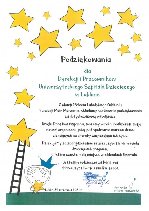 Składam w imieniu swoim, Pracowników Szpitala oraz Pacjentów serdeczne podziękowania za tę inicjatywę oraz za dotychczasowe akcje podjęte na rzecz pacjentów. Jednocześnie przekazuję najlepsze życzenia z okazji 15-lecia działalności Lubelskiego Oddziału Fundacji.